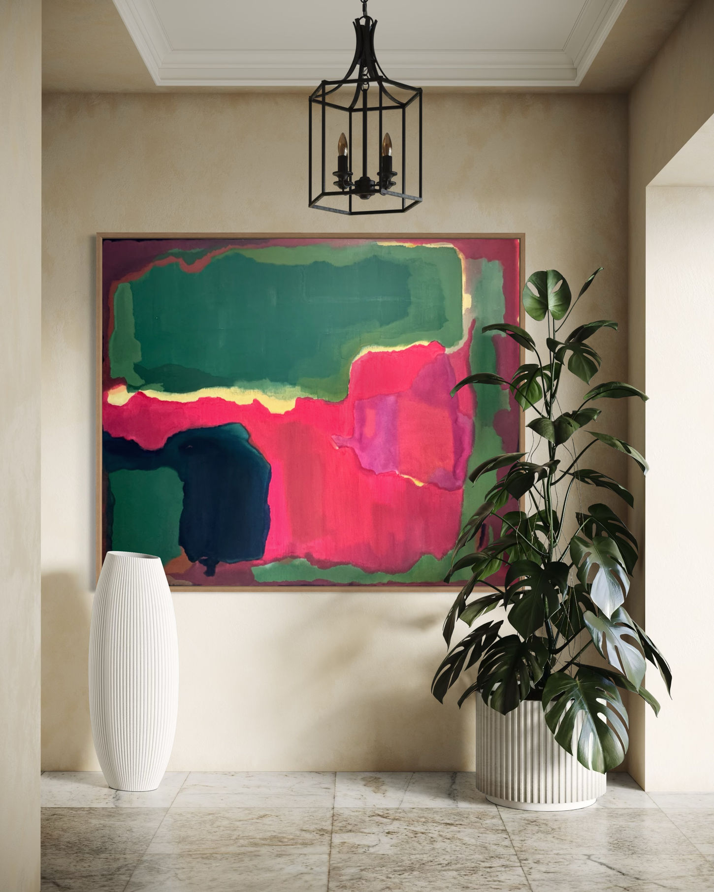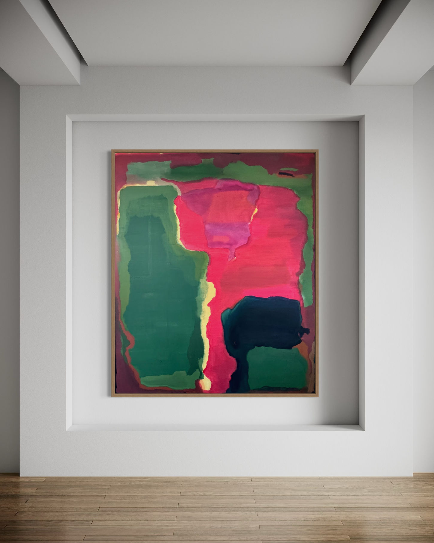 This large-scale oil painting centers on overlappings tains of quinacridone pinks, pale yellows, and warm olive greens. These layered hues cluster at the center, creating depth and subtle variations that drawa the viewer's gaze through their rich interplay.